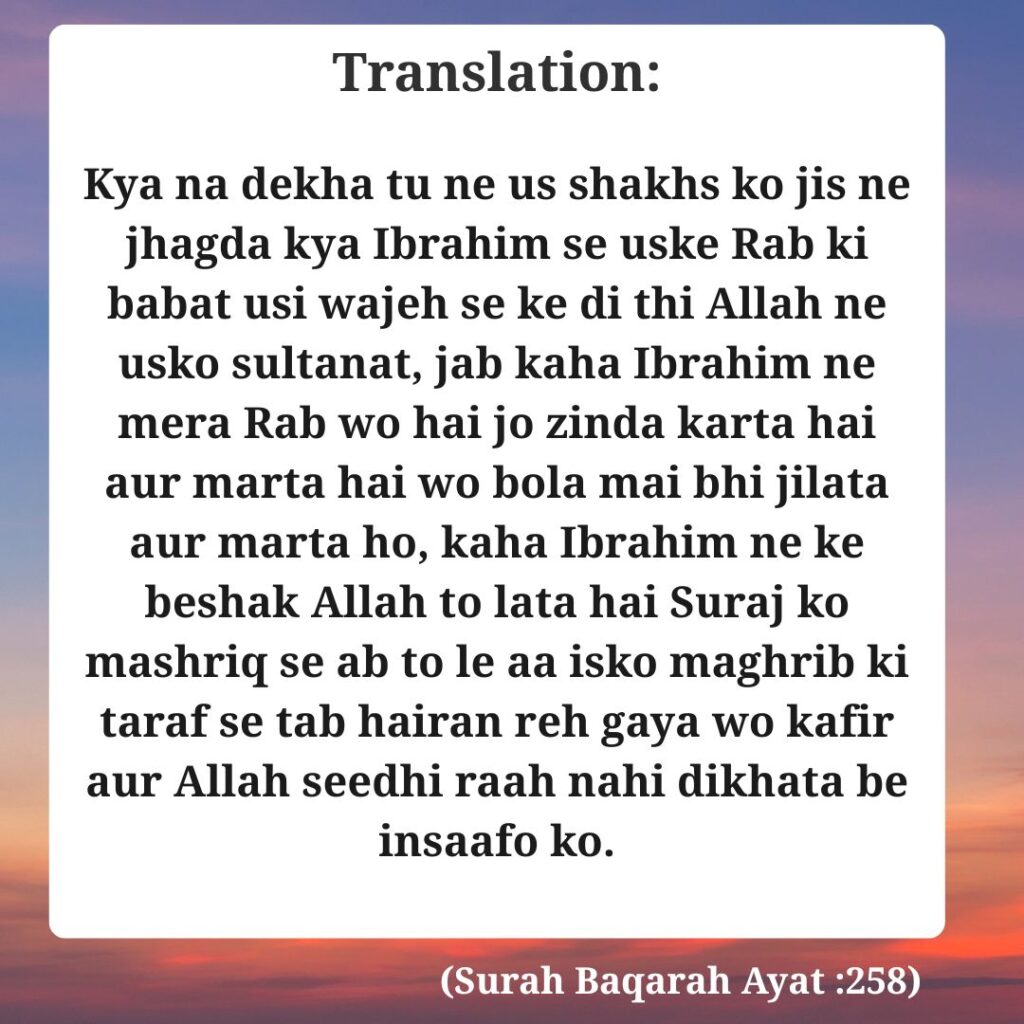 Ibrahim alaihissalam ne farmaya. Mera pokhta yaqin hai aur mai pure yaqin ke sath kehta hu ke Mera Rab apka Rab aur sabka Rab ek Allah hai. Jisne Asmano aur Zamin ko paida kya. Koi dusra uski Badshahi me sharik nhi ho sakta.