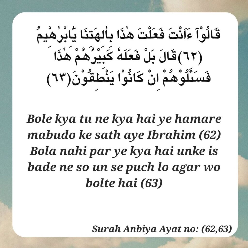 Logo ne Hazrat Ibrahim alaihissalam se kaha. Aye Ibrahim, kya tumne ye sab hamare mabudo ke sath kya hai? Hazrat Ibrahim (AS) ne jawab diya ke tum mujhse kyu puch rahe ho? Is bade but se pucho jo sidha khada hai. Aur uske pas todne ka hatyar hai. Shayad isne ye sab chote but tod diye hai.